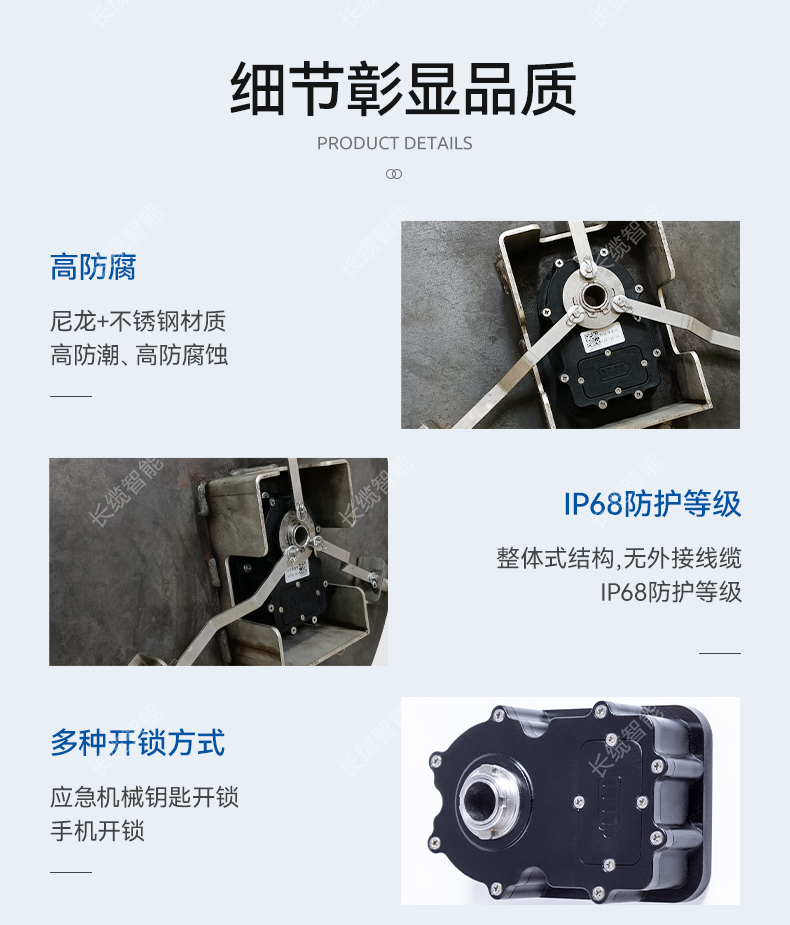 1. 鎖體外殼采用尼龍加玻纖混合材料,鎖栓、連桿采用304不銹鋼材料,具有極高的防潮、防腐蝕能力;