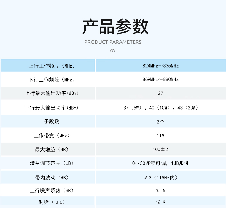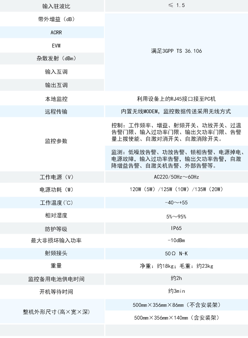 ? 下行輸出功率37dBm/40dBm/43dBm,上行輸出功率27dBm。