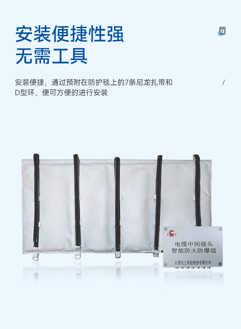 電纜防火防爆毯能抑制中間接頭短路故障所產(chǎn)生的高壓電弧,從而降低了由于電纜接頭事故對(duì)周圍人員的潛在傷害風(fēng)險(xiǎn),防爆毯安裝便捷,通過預(yù)附在防護(hù)毯上的7條尼龍?jiān)鷰Ш虳型環(huán),可以方便地將其加裝在施工完成的電纜中間接頭外,無需其它工具。