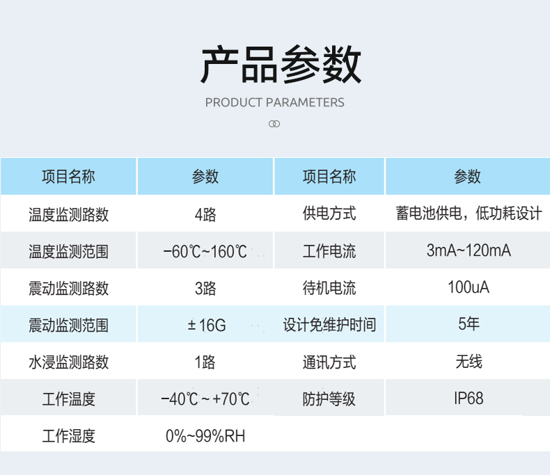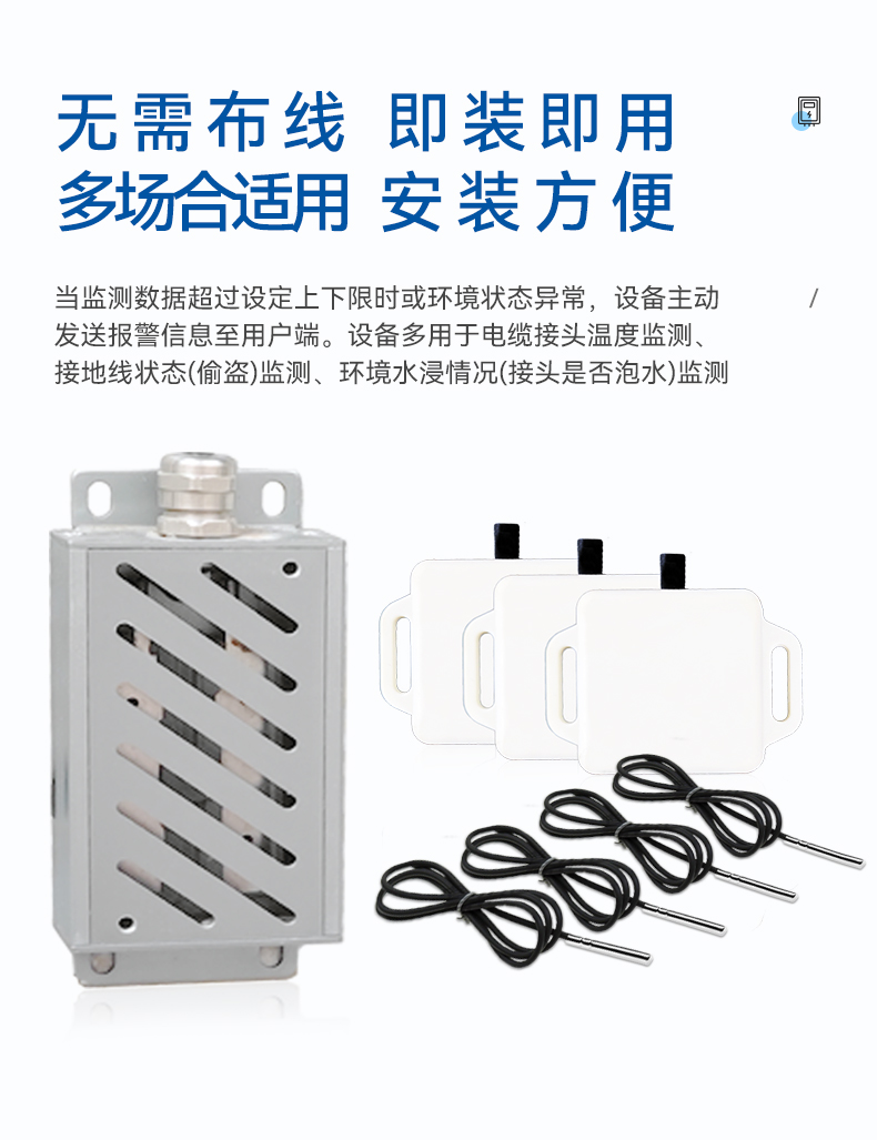 ? 可用于電纜接頭溫度監(jiān)測、接地線狀態(tài)(偷盜)監(jiān)測、環(huán)境水浸情況監(jiān)測(接頭是否泡水)等場合。