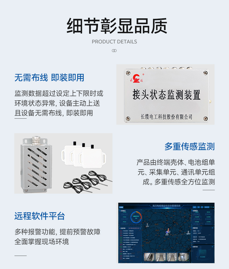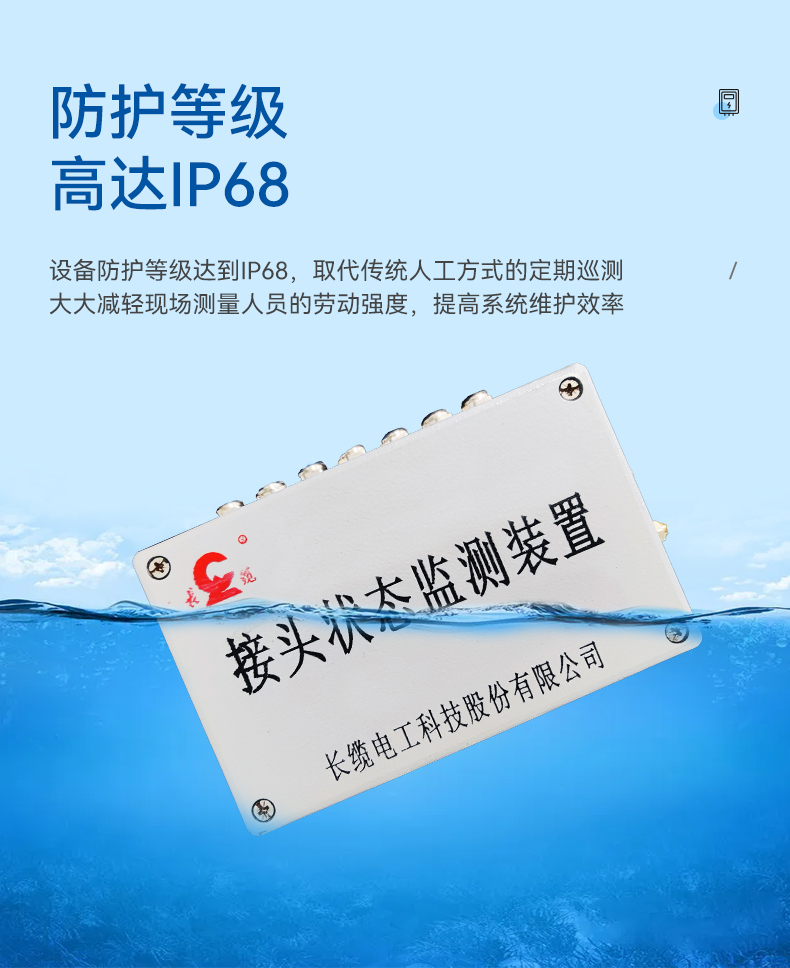電纜接頭狀態(tài)監(jiān)測裝置具備溫度(點測溫)、震動、水浸等監(jiān)測功能,可用于電纜接頭溫度監(jiān)測、接地線狀態(tài)(偷盜)監(jiān)測、環(huán)境水浸情況監(jiān)測(接頭是否泡水)等場合。